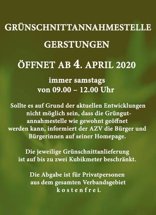 Sollte es auf Grund der aktuellen Entwicklungen nicht möglich sein, dass die Grüngutannahmestellen wie gewohnt geöffnet werden kann, informiert der AZV die Bürger und Bürgerinnen hier auf seiner Homepage.