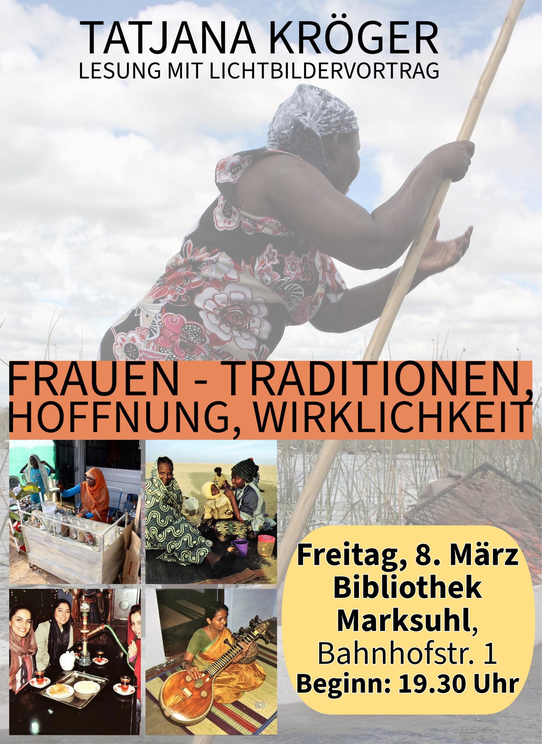 Globetrotterin und Reisebuchautorin Tatjana Kröger aus Wildeck gibt in ihrer Lesung mit Lichtbildervortrag Einblicke in die Lebensumstände von Frauen in anderen Ländern. Sie begleitet verschiedene afrikanische Frauen in ihrem Alltag und erzählt, wie Frauen in Vietnam, Nepal und Bangladesh ihren Lebensunterhalt verdienen. Auf ihren unzähligen Allein-Reisen als Frau ist Tatjana Kröger leicht in Kontakt zu den einheimischen Frauen gekommen, hat viel über sie erfahren und Fotos machen können. Wir laden sehr herzlich zur Lesung ein!