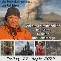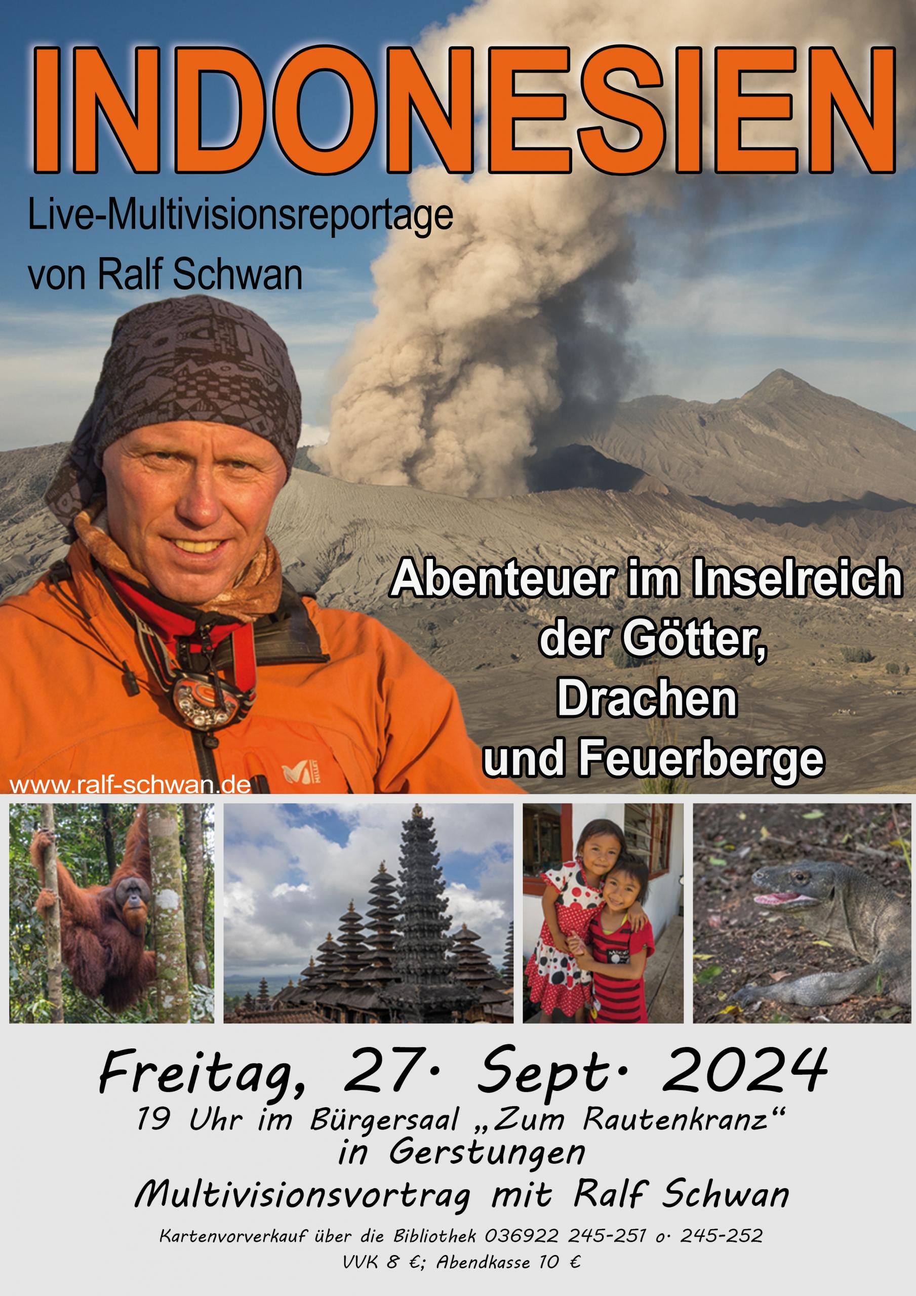 Eine Reise durch Indonesien, vielfältig, geheimnisvoll und spannend. Der Thüringer, Ralf Schwan, berichtet über emotionale Begegnungen mit Orang Utans im dichten Regenwald Sumatras, von Besteigungen aktiven Vulkanen des „Ring of Fire“ auf Java und Bali (Merapi, Semeru, Bromo, Kawah Ijen und Agung), Tempeln, Göttern, bunten, quirligen exotischen Märkte und spannenden Momenten im Reich der „Drachen“ bei den Komodowaranen. Freuen Sie sich auf ein vielschichtiges und spannendes Porträt, mit eindrucksvollen Fotos und Videos, des Inselarchipels zwischen Asien und Australiens und erleben Sie das Abenteuer des „Ring of Fire“. Kartenvorverkauf über die Bibliothek (VVK 8,- € / Abendkasse 10,- €)