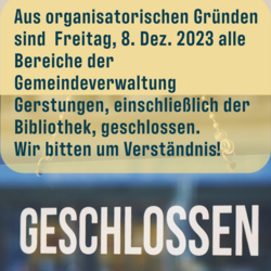 Aus organisatorischen Gründen sind Freitag, 8. Dez. 2023 alle Bereiche der Gemeindeverwaltung Gerstungen, einschließlich der Bibliothek, geschlossen. Wir bitten um Verständnis!