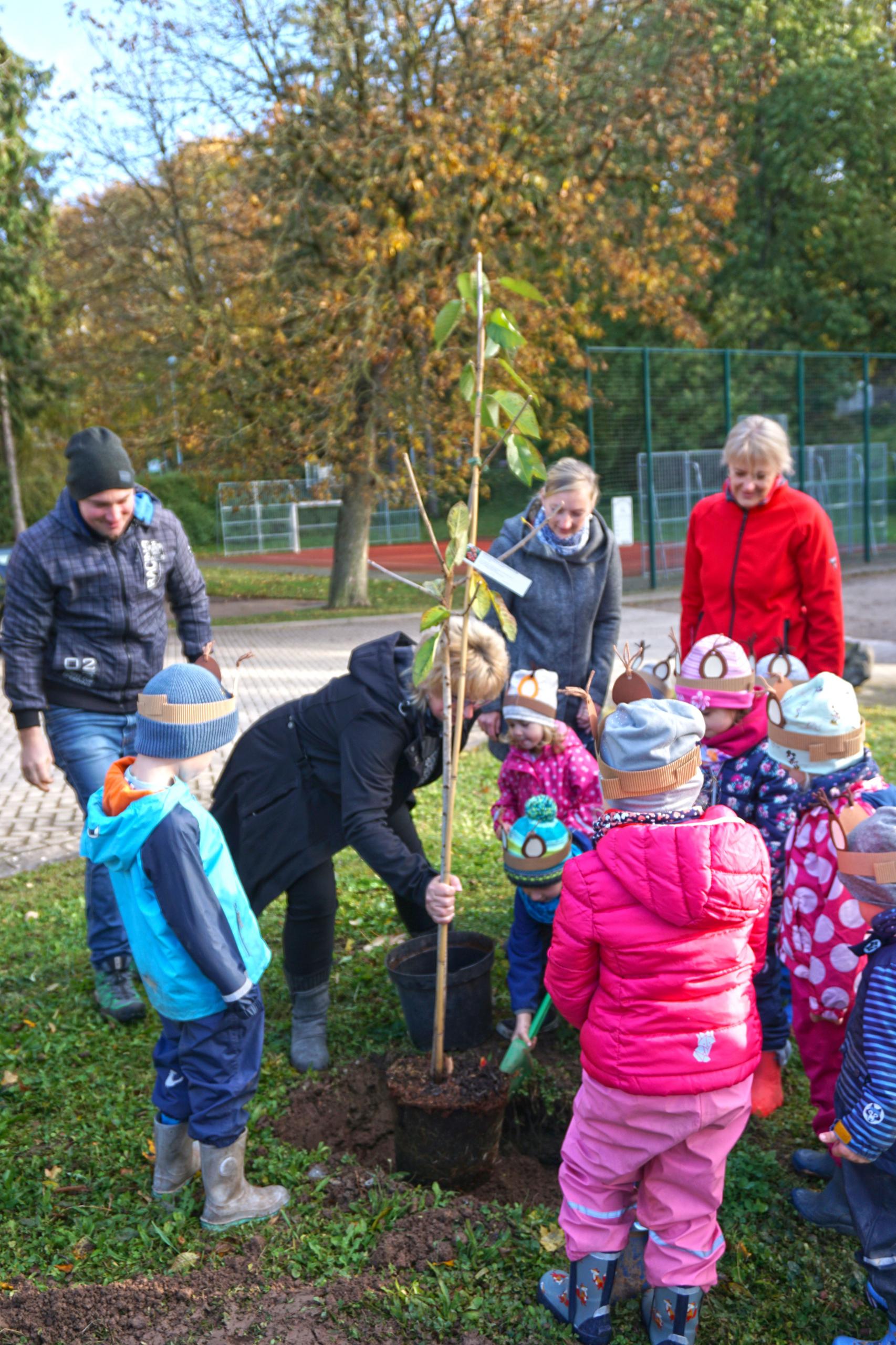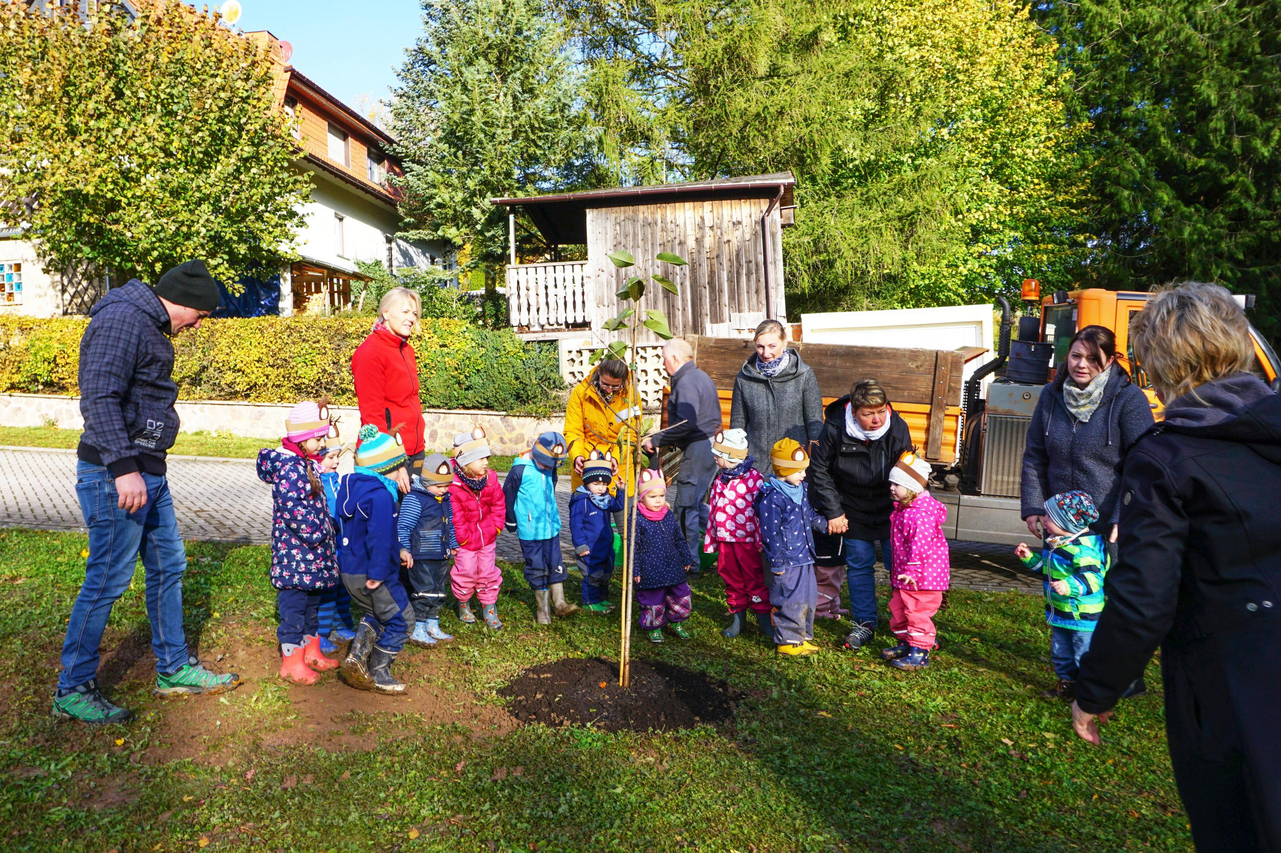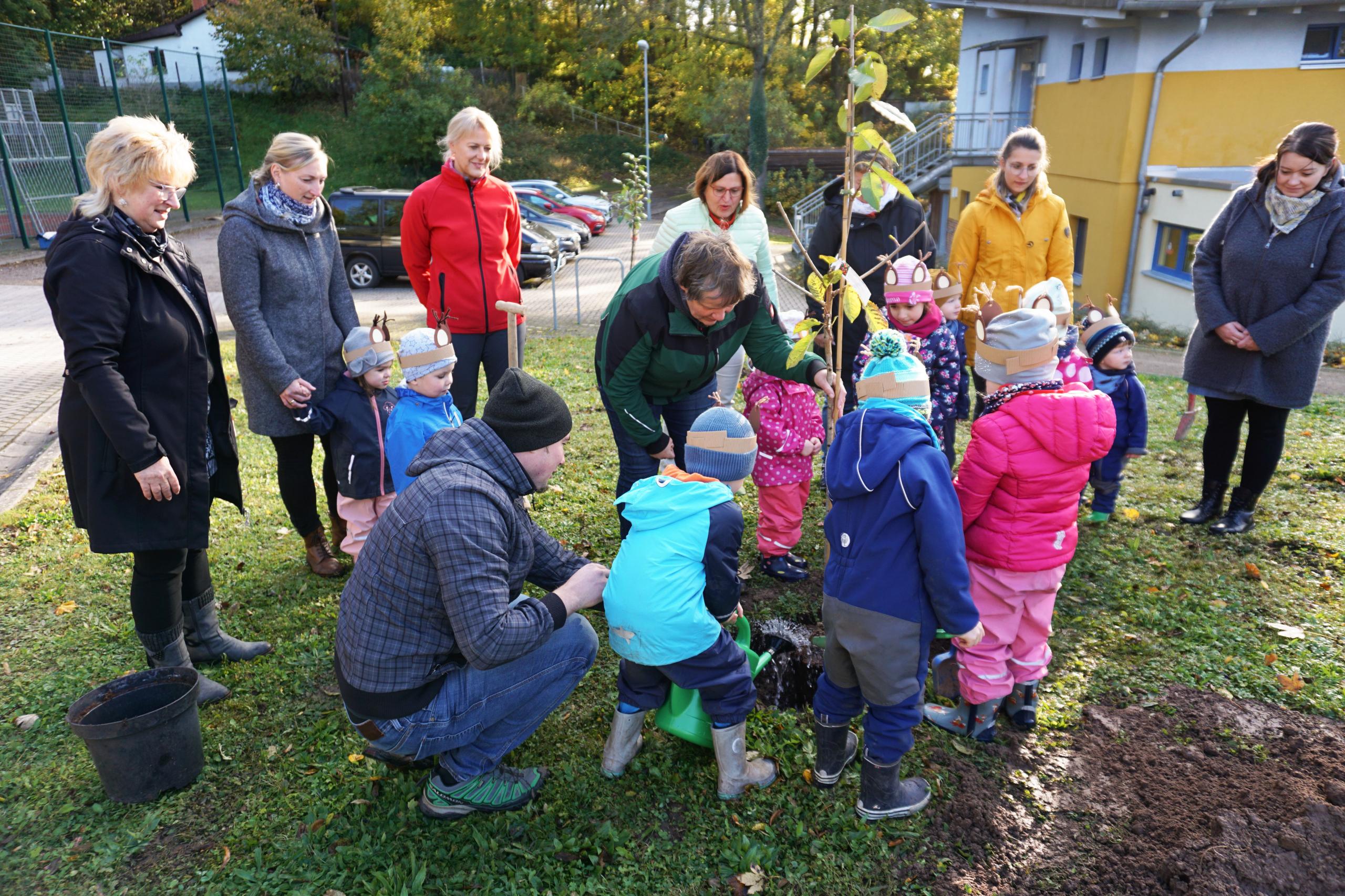 Für diesen besonderen Tag stellte sich das Wetter nach dem ersten Herbststurm von seiner sonnigen Seite ein. Große Freude herrschte bei den Förthaer Kindergartenkindern, den Erzieherinnen und dem Erzieher, denn geplant für diesen wunderbaren Tag waren eine kleine Baumpflanzaktion, der Besuch der Bürgermeisterin und eine Namensweihe.