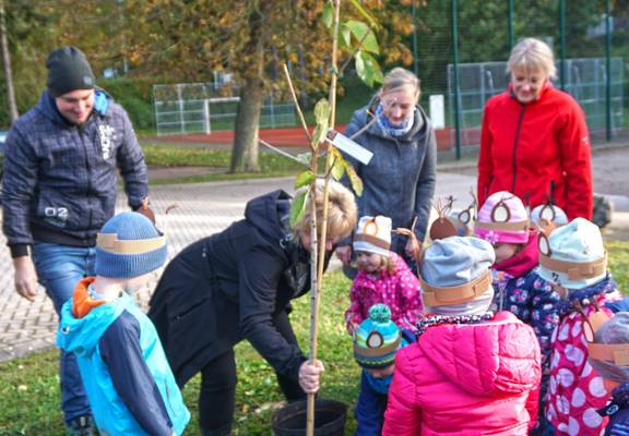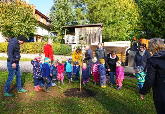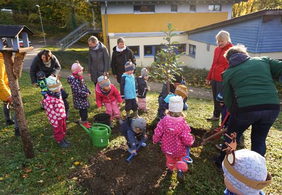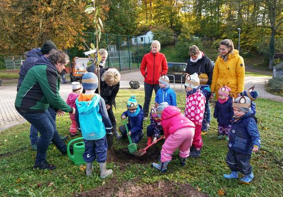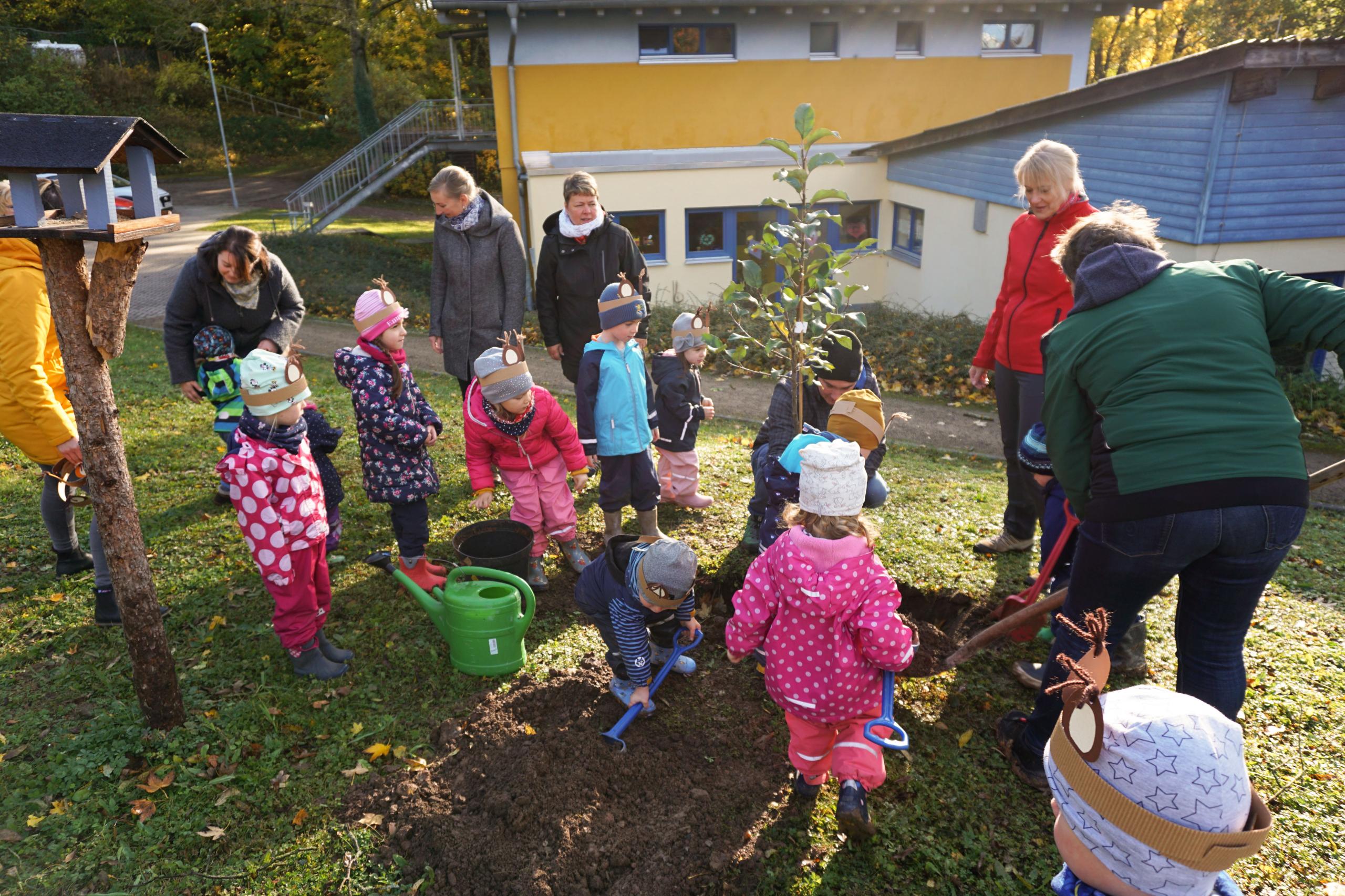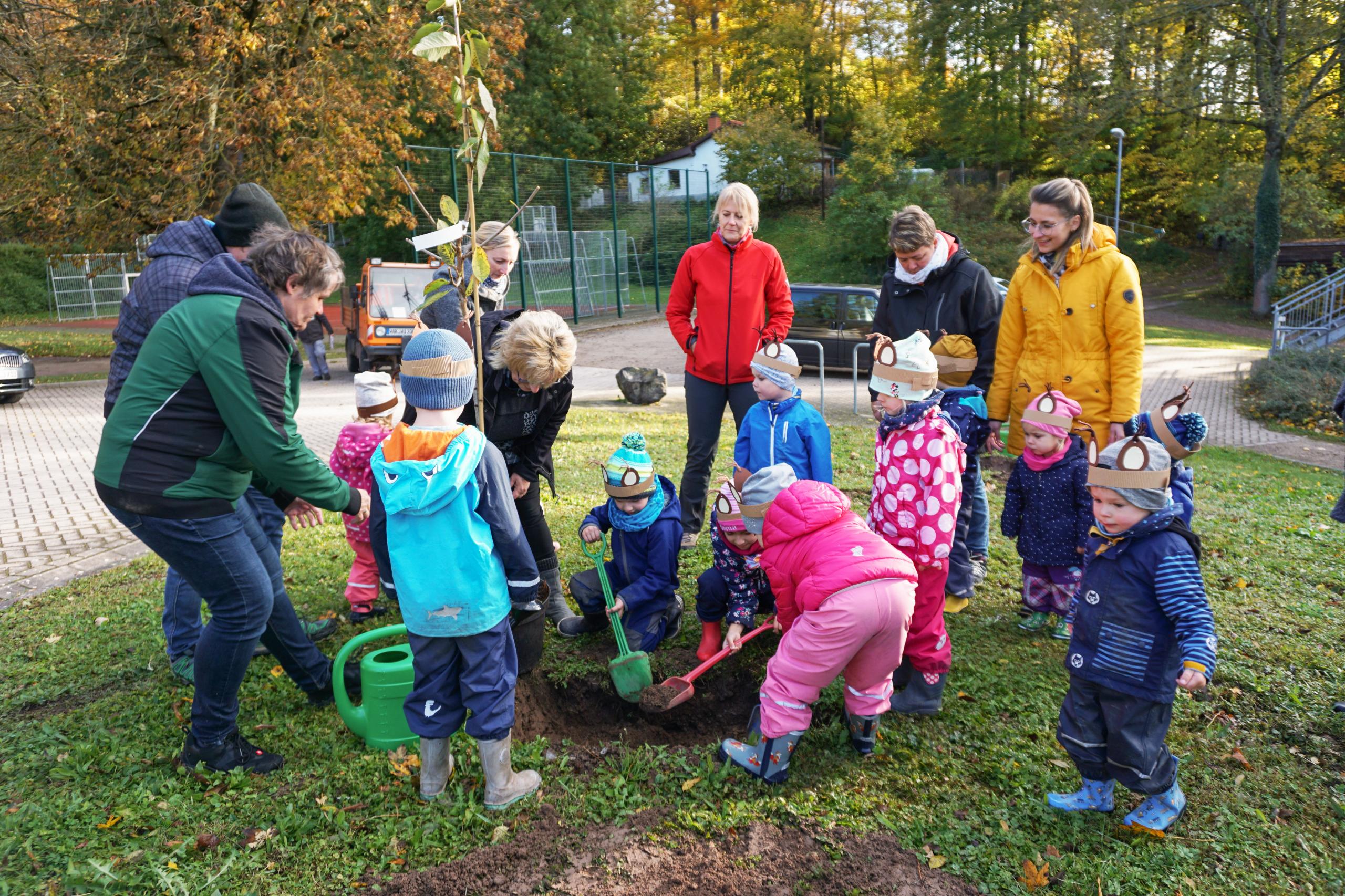 Für diesen besonderen Tag stellte sich das Wetter nach dem ersten Herbststurm von seiner sonnigen Seite ein. Große Freude herrschte bei den Förthaer Kindergartenkindern, den Erzieherinnen und dem Erzieher, denn geplant für diesen wunderbaren Tag waren eine kleine Baumpflanzaktion, der Besuch der Bürgermeisterin und eine Namensweihe.