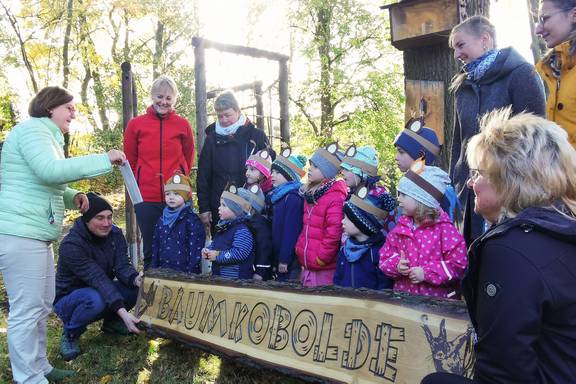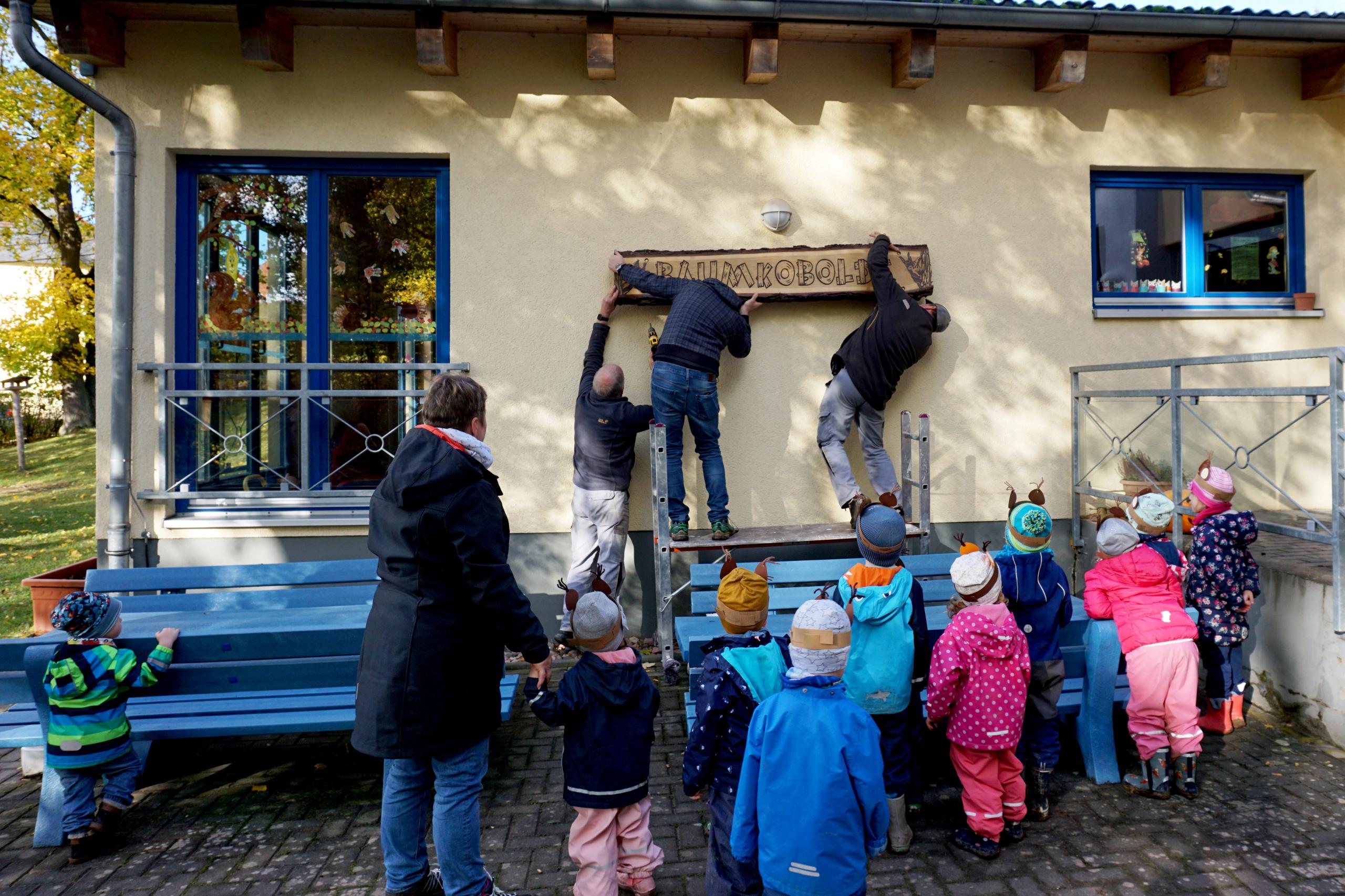 Im feierlichen Rahmen trugen die Kinder Lieder und Gedichte über die flinken Tiere vor. Im Anschluss wurde im Beisein der Bürgermeisterin und weiteren Gästen das neue Namensschild „BAUMKOBOLDE“ am Gebäude des Kindergartens angebracht.