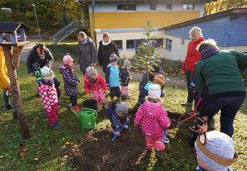 Begonnen wurde mit dem gemeinsamen Einpflanzen von zwei Apfelbäumen und einem Kirschbaum. Es war nicht zu übersehen, dass alle Kinder jede Menge Spaß beim Schaufeln, Einpflanzen und anschließendem Gießen hatten. Die Baumpflanzaktion entstand als Teil aus dem Projekt „Mehr Natur in Dorf und Stadt“, bei dem gemeindliche Flächen naturnah umgestaltet werden. Die Pflanzaktion passte zudem prima zum Konzept des Förthaer Kindergartens, schon den Jüngsten mehr Nähe zur Natur zu vermitteln.