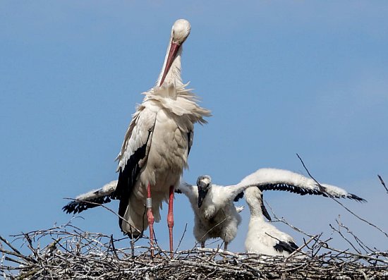 "Hallo! Nun sind wir schon bald groß, da unsere Eltern uns gut versorgt haben. Es ist nicht mehr weit hin, bis wir unsere lange Reise in den Süden antreten müssen. Damit wir gut gewappnet sind, bekommen wir morgen am Donnerstagfrüh um 8.00 Uhr unsere Ringe von Klaus Schmidt. Wer das verfolgen möchte, ist herzlich eingeladen zum Gerstunger Schloss in der Sophienstraße. Eure Storchenkinder"