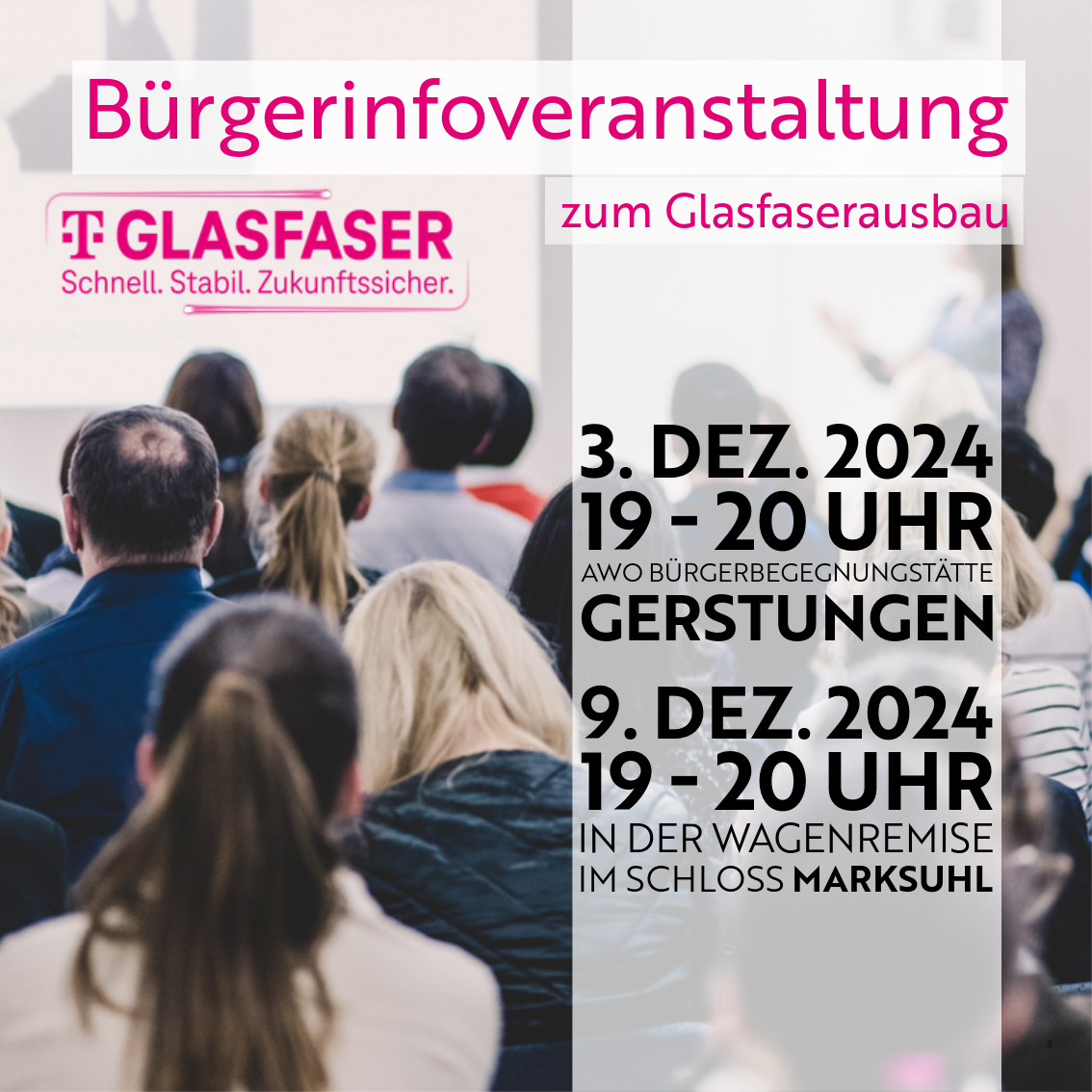 Die Deutsche Telekom veranstaltet zwei Bürgerinfoabende zum Thema "Glasfaserausbau" in unserer Region. Alle interessierten Bürgerinnen und Bürger sind herzlich eingeladen, sich über den geplanten Ausbau und die damit verbundenen Vorteile zu informieren.