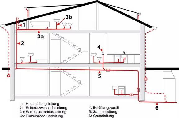 - Die Hauptlüftung muss vom obersten Anschluss an die Fallleitung bis über das Dach verlaufen. Diese Leitung führt kein Abwasser und muss in der gleichen Nennweite wie die Schmutzwasserfallleitung ausgeführt werden.