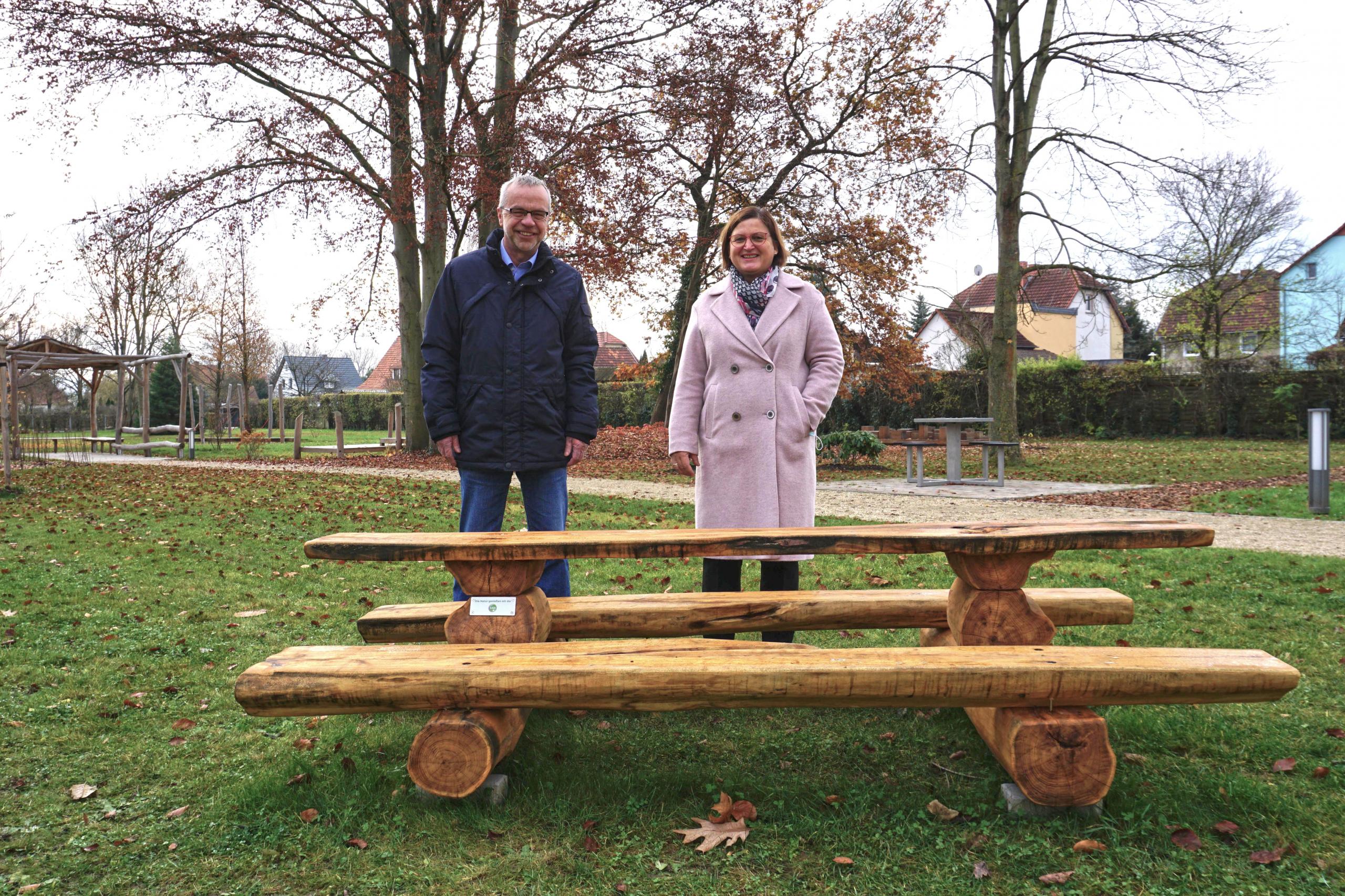 Am 18. Oktober nahm Frau Bürgermeisterin Hartung die tolle neue Sitzgelegenheit von Herrn Gisselmann (EAM) entgegen. Künftig wird die neue und aus sehr haltbarem Robinienholz gefertigte Bank viele Besucher des Mehrgenerationen-Aktivparks auch mal zum Verweilen einladen.