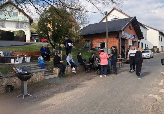 Nach kurzer Absprache teilten sich mehrere Kleingruppen auf um die Dorfplätze zu reinigen und die Straße Richtung Marksuhl von Schnapsflaschen und Zigarettenschachteln zu befreien. Unsere vielen fleißigen Kinder sammelten den Müll und Unrat um ganz Burkhardtroda. Die Jungs und Mädels der Kirmesgesellschaft machten währenddessen unseren „Stall“ schön und schichteten unser Maifeuer auf eine beachtliche Höhe.