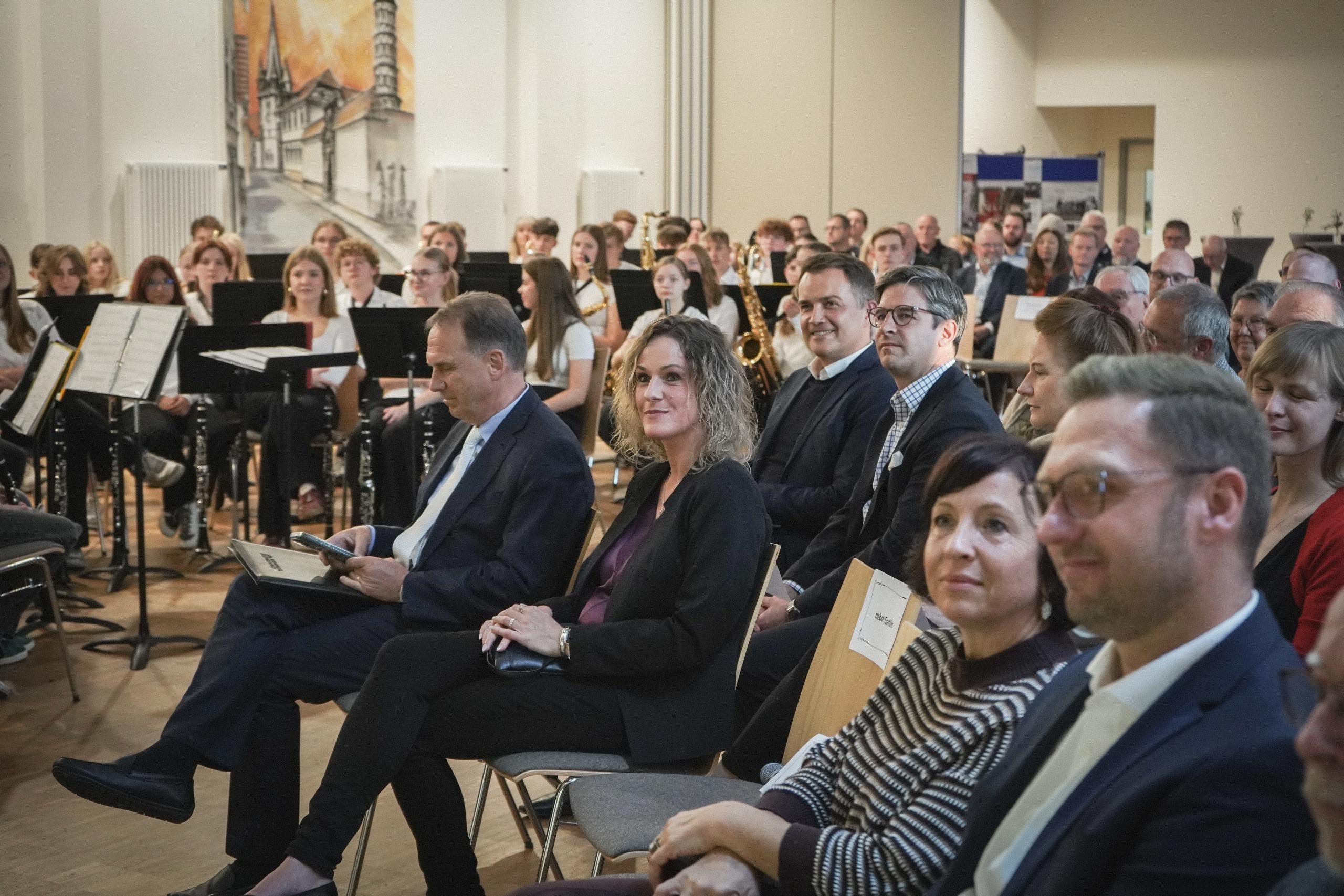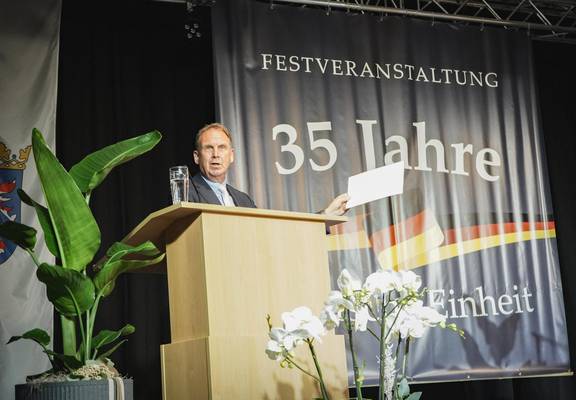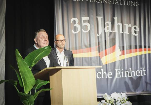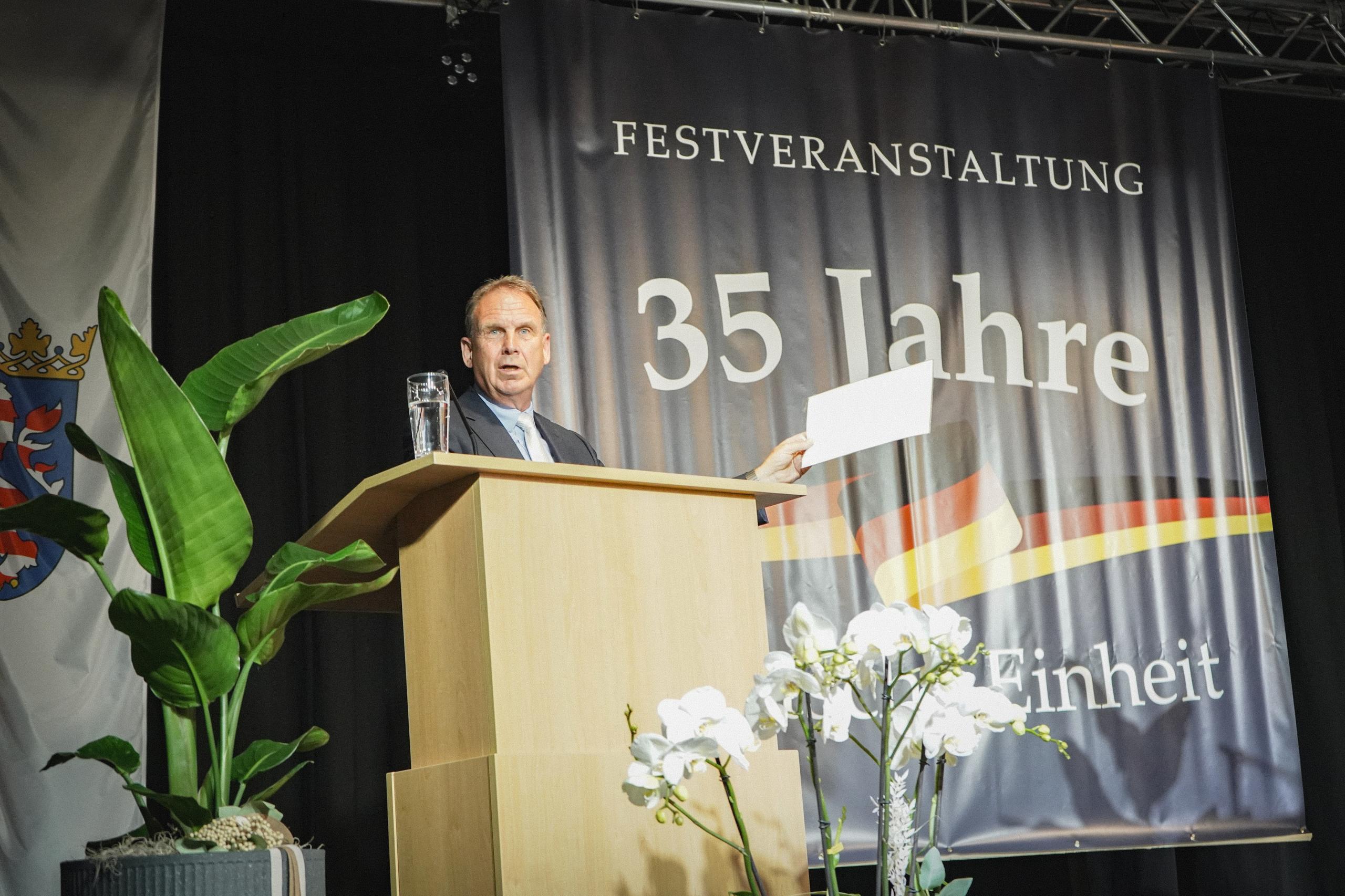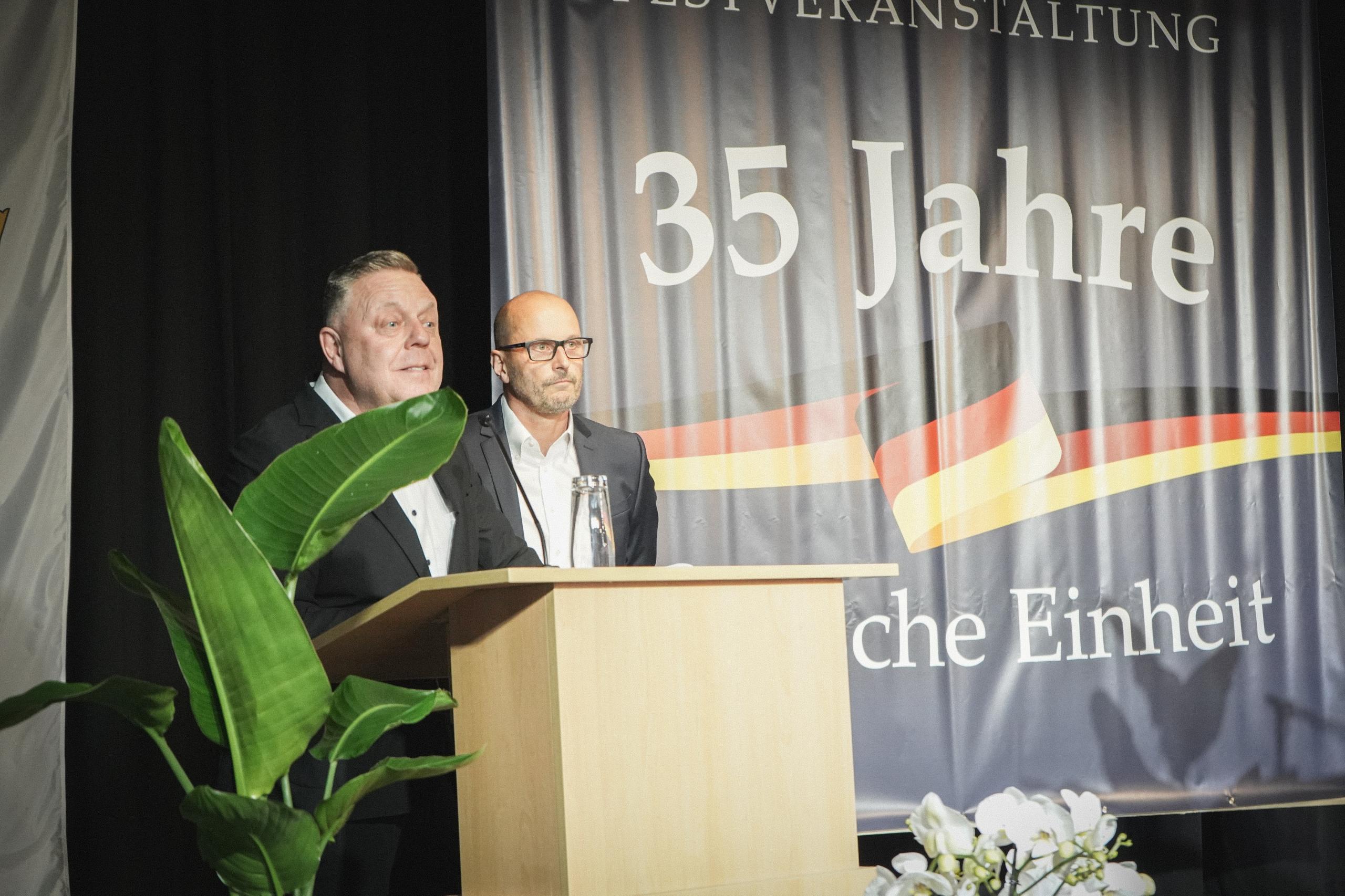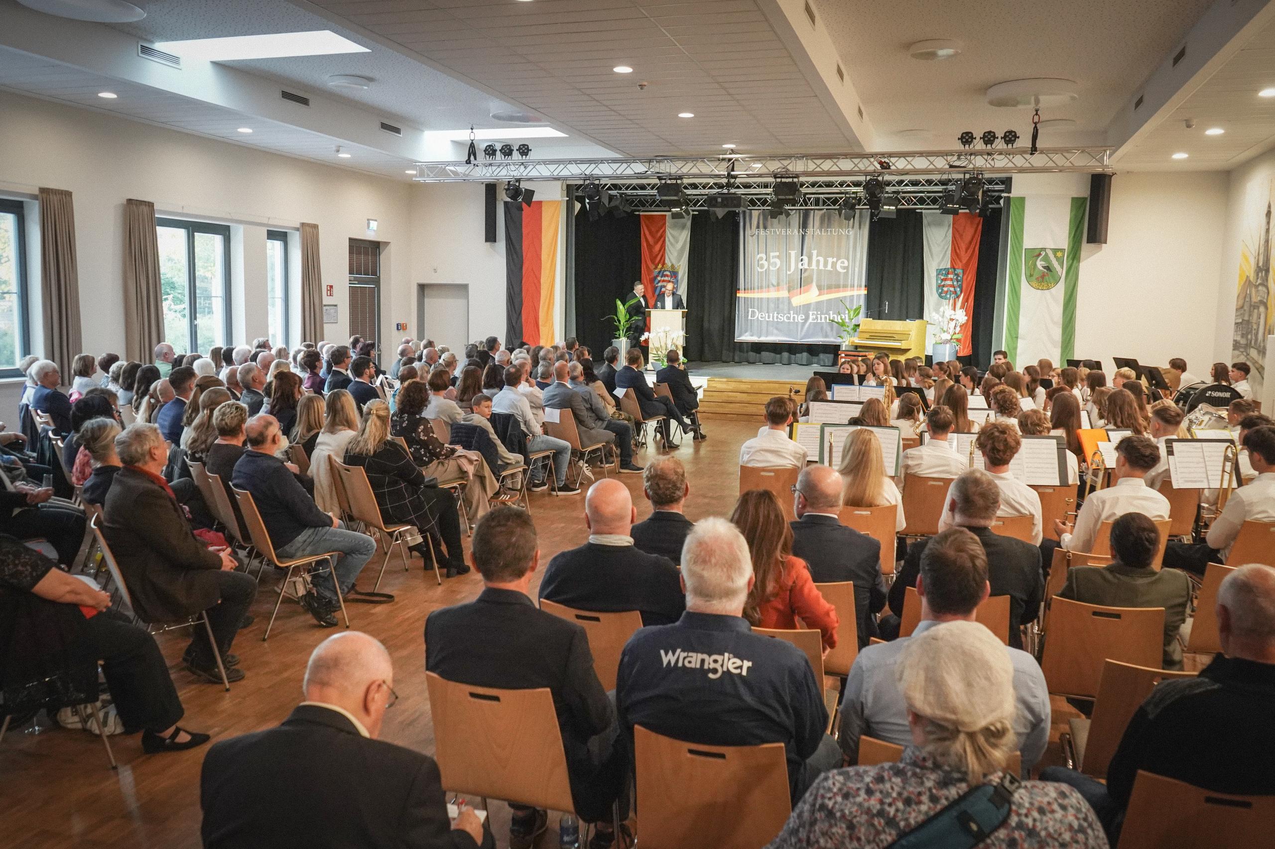 Den Auftakt bildete eine musikalische Eröffnung durch zahlreiche Schüler des Philipp-Melanchthon-Gymnasiums. Es folgten Begrüßungsworte von Schulleiter Gerald Taubert und Bürgermeister Daniel Steffan. Gerald Taubert erinnerte daran, dass „Einheit kein abgeschlossener Zustand, sondern ein fortwährender Prozess“, der immer wieder neu herausfordere, Brücken zu bauen und Gegensätze zu überwinden. „In unseren Schulen“, so Taubert weiter, „legen wir die Grundlagen für kommende Generationen – für junge Menschen, die nicht in Ost und West denken.“