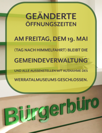Am Freitag, dem 19. Mai 2023 (Tag nach Himmelfahrt) bleibt die Gemeindeverwaltung und alle Außenstellen mit Ausnahme des Werratalmuseums geschlossen.
