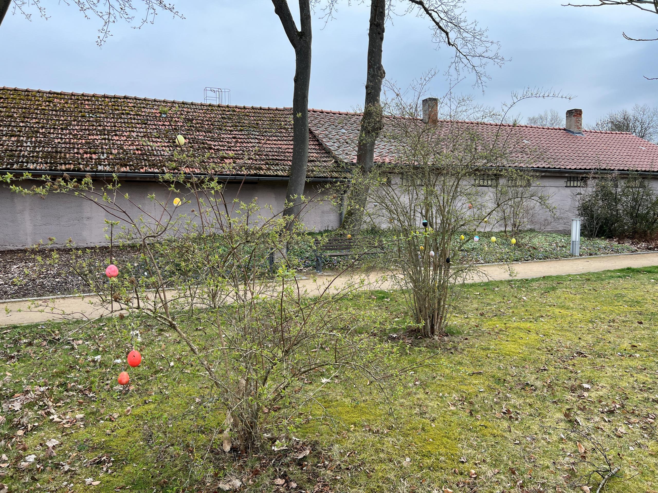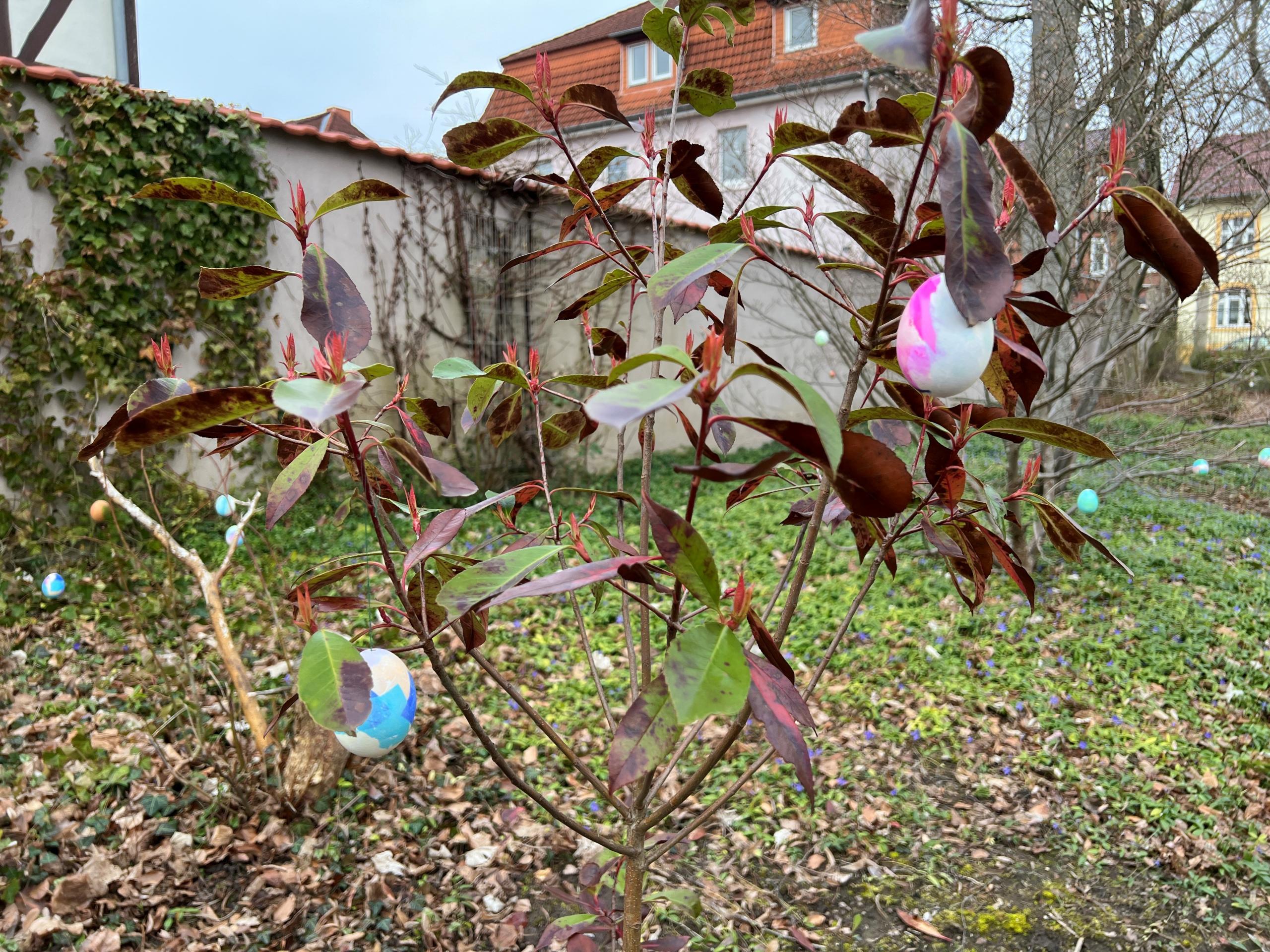 Für die Verschönerung im Rathausgarten sorgten die fleißigen Kinder, Lehrer und Hortner der Fritz-Erbe-Grundschule aus Gerstungen, die mit buntbemalten Eiern die Büsche und Sträucher