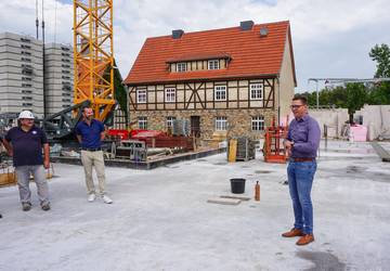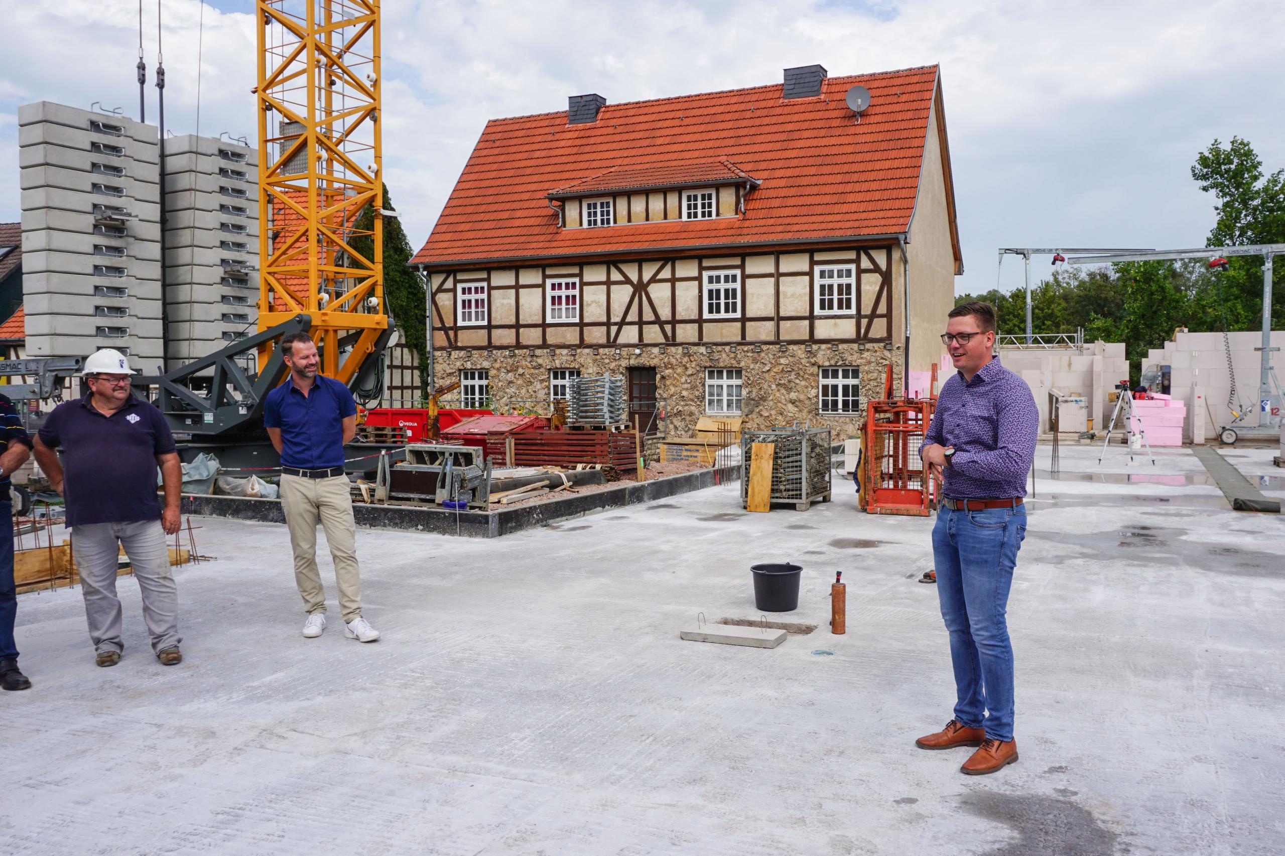 Nicht nur die bunten Wimpel im Zentrum Oberellens verrieten, hier hatte man und hat etwas zu feiern. Am Wochenende nach dem mehr als gut besuchten Seifenkistenrennen fand am Montag, dem 12. September 2023 die offizielle Grundsteinlegung des Gebäudes für „Altersbetreutes Wohnen“ im Beisein der Planer, Baufirmen, Pflegedienstvertreter, Mitglieder des Vereins „Interessengemeinschaft Schlosshof Oberellen“, Gerstungens Bürgermeister sowie zahlreicher interessierter Bürgerinnen und Bürger statt.