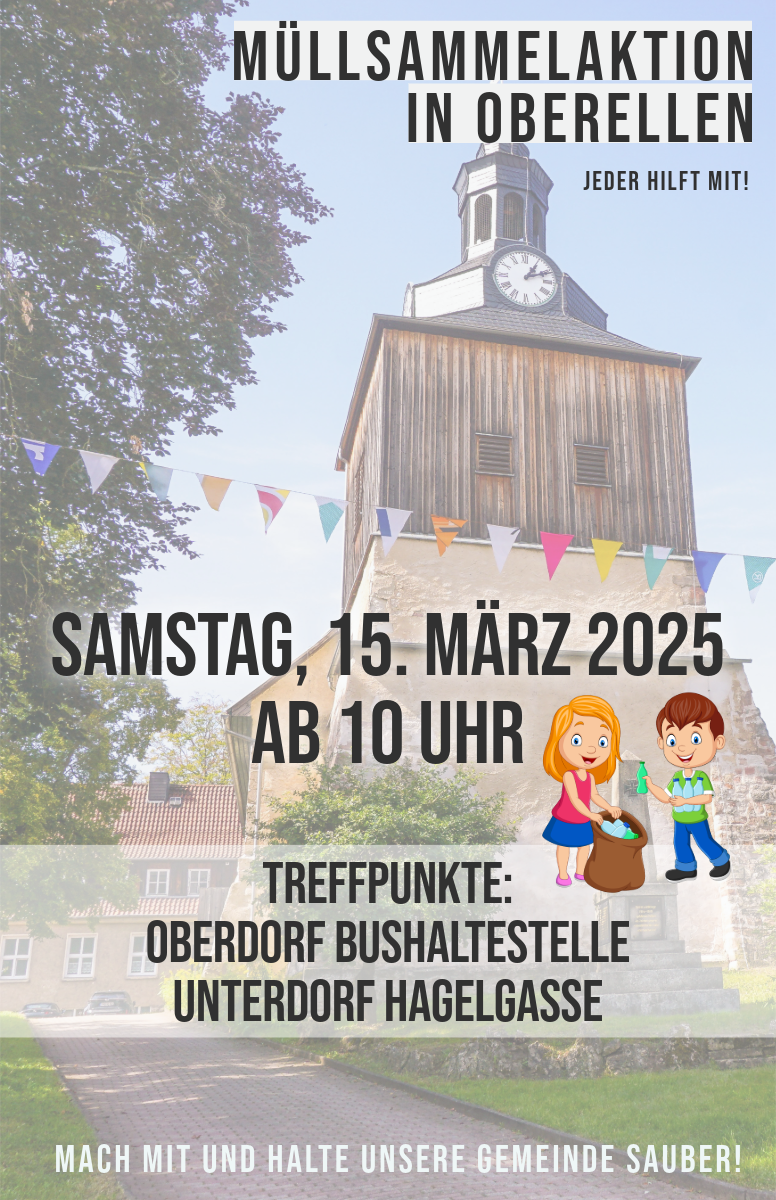 Am Samstag, 15. März 2025 findet im Ortsteil Oberellen wieder die jährliche Müllsammelaktion statt. Gestartet wird um 10 Uhr – es gibt zwei Treffpunkte: