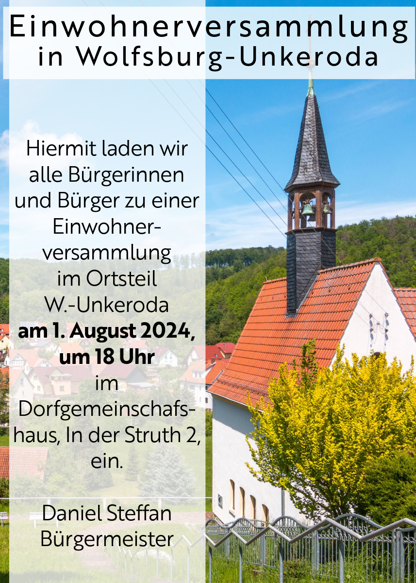 Hiermit laden wir alle Bürgerinnen und Bürger zu einer Einwohnerversammlung im Ortsteil Wolfsburg-Unkeroda ein: