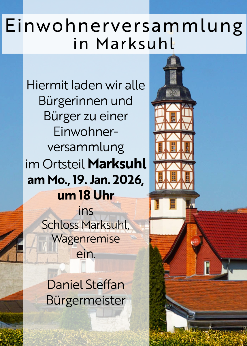 Die nächste Einwohnerversammlung findet am Montag, dem 19. Januar 2026, um 18 Uhr in Marksuhl (Wagenremise im Schloss) statt.