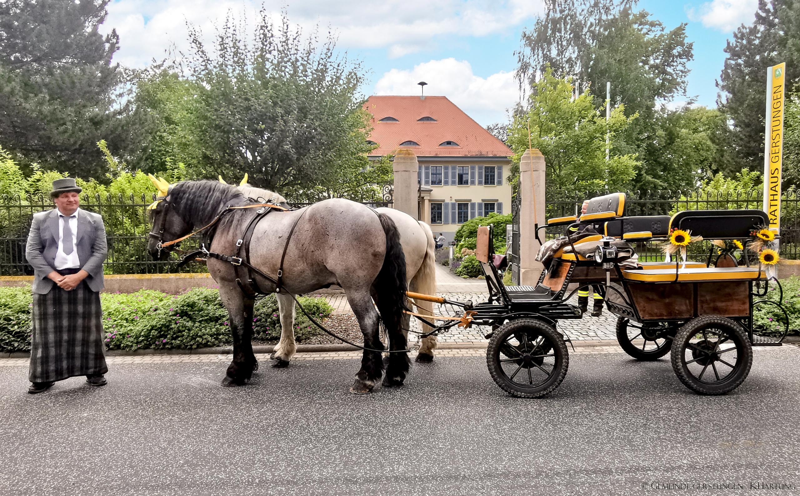 Das einmalige Bild der wundervollen Hochzeitskutsche vor dem Gerstunger Rathaus mit den Pferden und ihrem Kutscher vom Ramsborn bei Eisenach kann man doch mal stolz präsentieren.