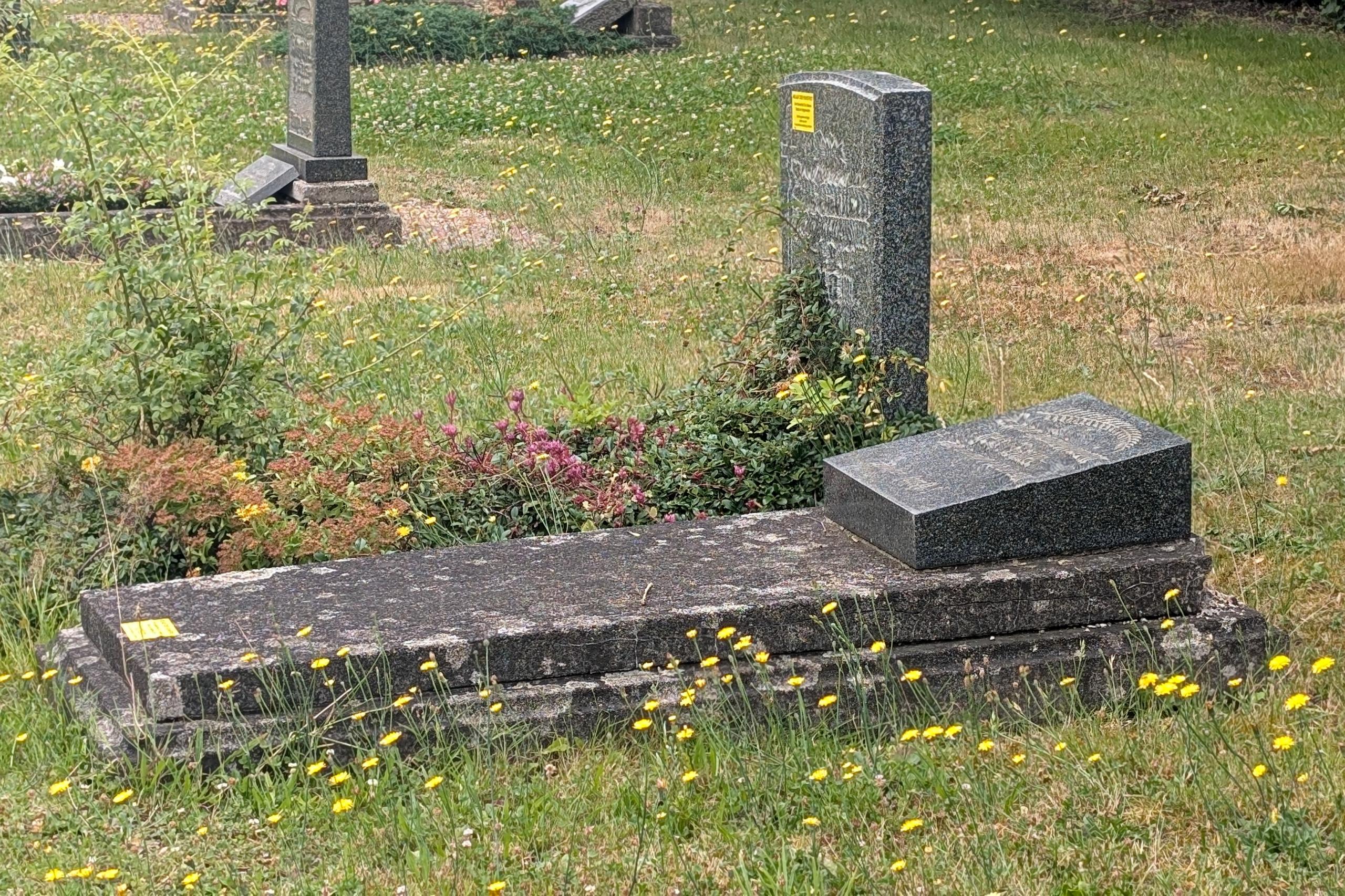 Auf den Friedhöfen in Untersuhl und Gerstungen werden durch Mitarbeiter der Friedhofsverwaltung im Juli 2025 an einigen Grabstätten gelbe Hinweisschilder angebracht.