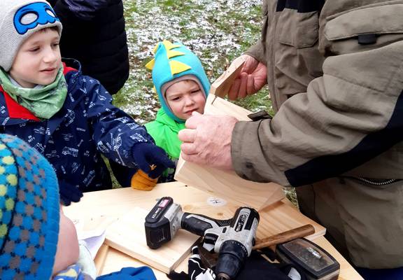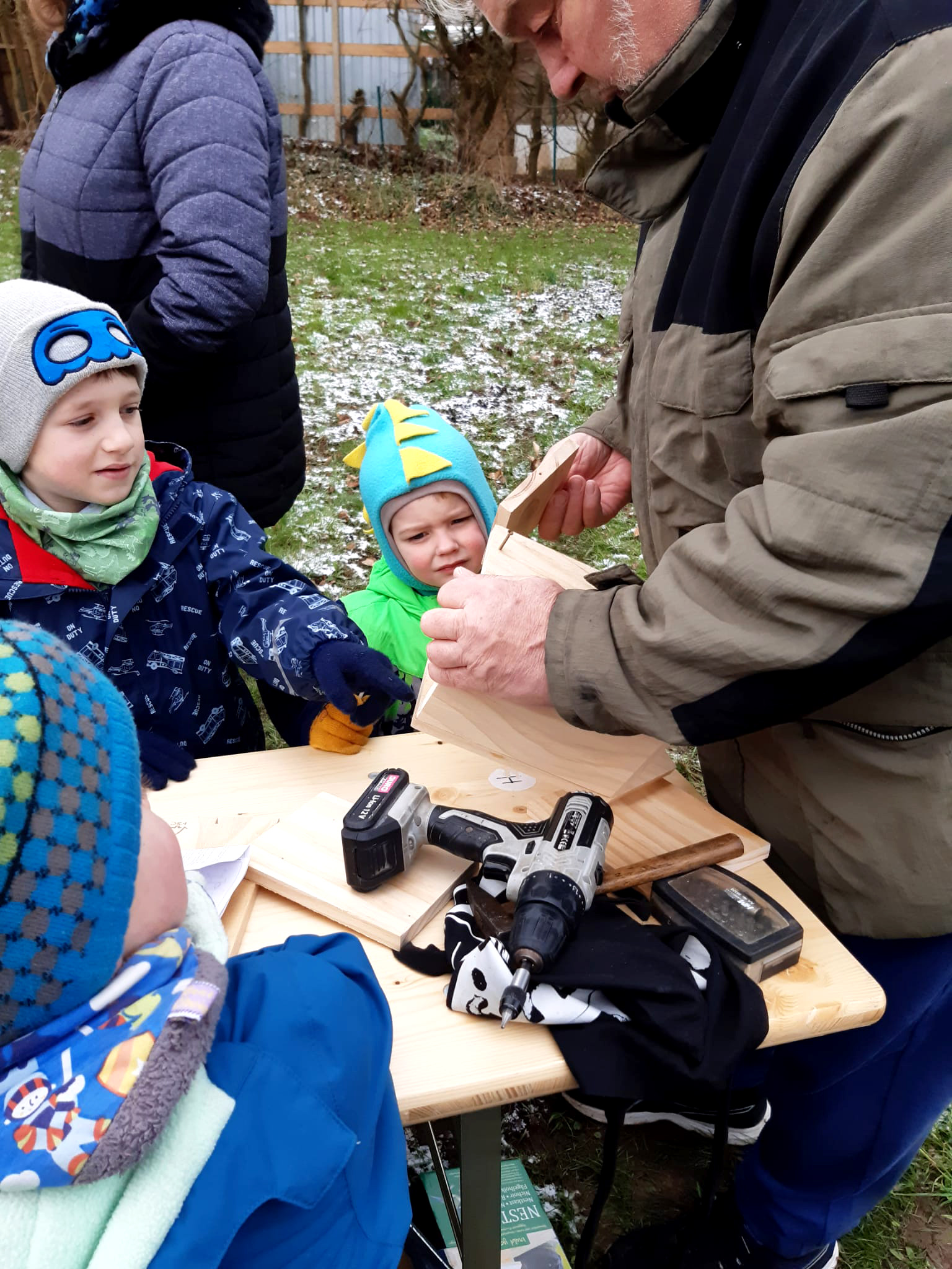 Im Februar wurde kräftig gehämmert und geschraubt, sodass danach elf verschiedene Nistkästen für Meisen, Rotkehlchen & Co. am Rand der Wiese aufgehängt werden konnten.