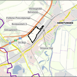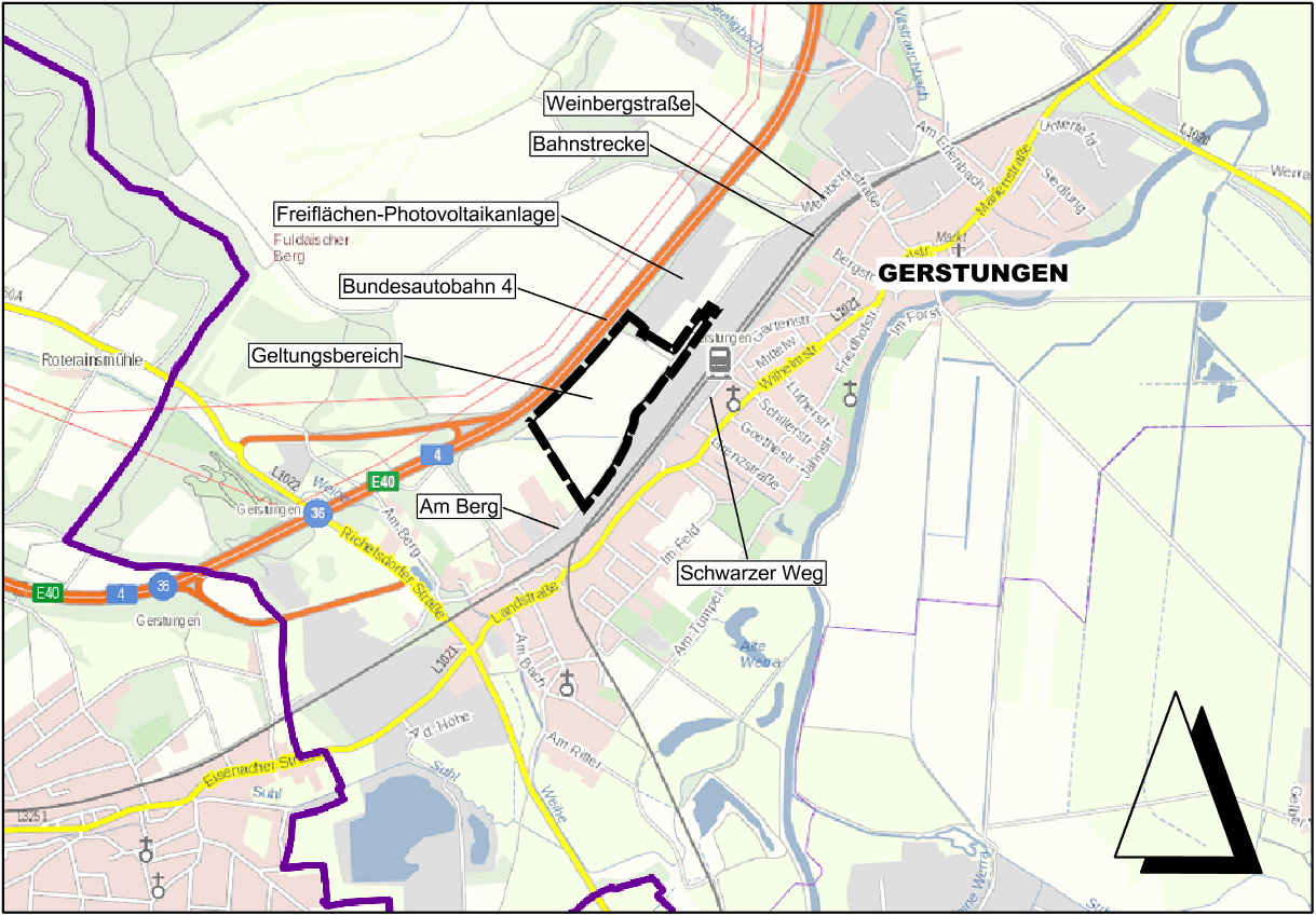 Der Geltungsbereich der 1. Änderung wird im Wesentlichen im Osten von der Bahnstrecke Halle-Bebra und im Westen von der Bundesautobahn BAB 4 begrenzt. Im Norden ist eine Freiflächen-Photovoltaikanlage vorhanden und begrenzt hier den Geltungsbereich der 1. Änderung. Im Süden grenzt die Siedlung „Über der Eisenbahn“ an sowie die Straße „Am Berg“. Der Geltungsbereich der 1. Änderung des Bebauungsplans Nr. 15 Gewerbegebiet „Oberhalb der Bahn“ der Gemeinde Gerstungen ist der Anlage zu entnehmen.