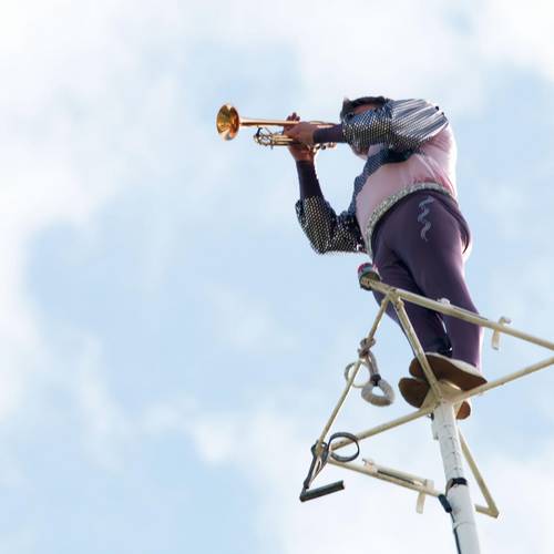 Den meisten Besuchern stockte vermutlich der Atem, als Alexander Weisheit auf die 62 Meter hohe Mastspitze gezogen wurde, um dort auf dem bis zu 5 Meter schwingenden Mast als menschliche Fahne in der Luft zu schwingen und schließlich sein legendäres Trompetensolo zu blasen.
