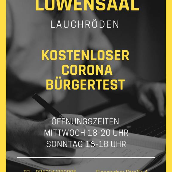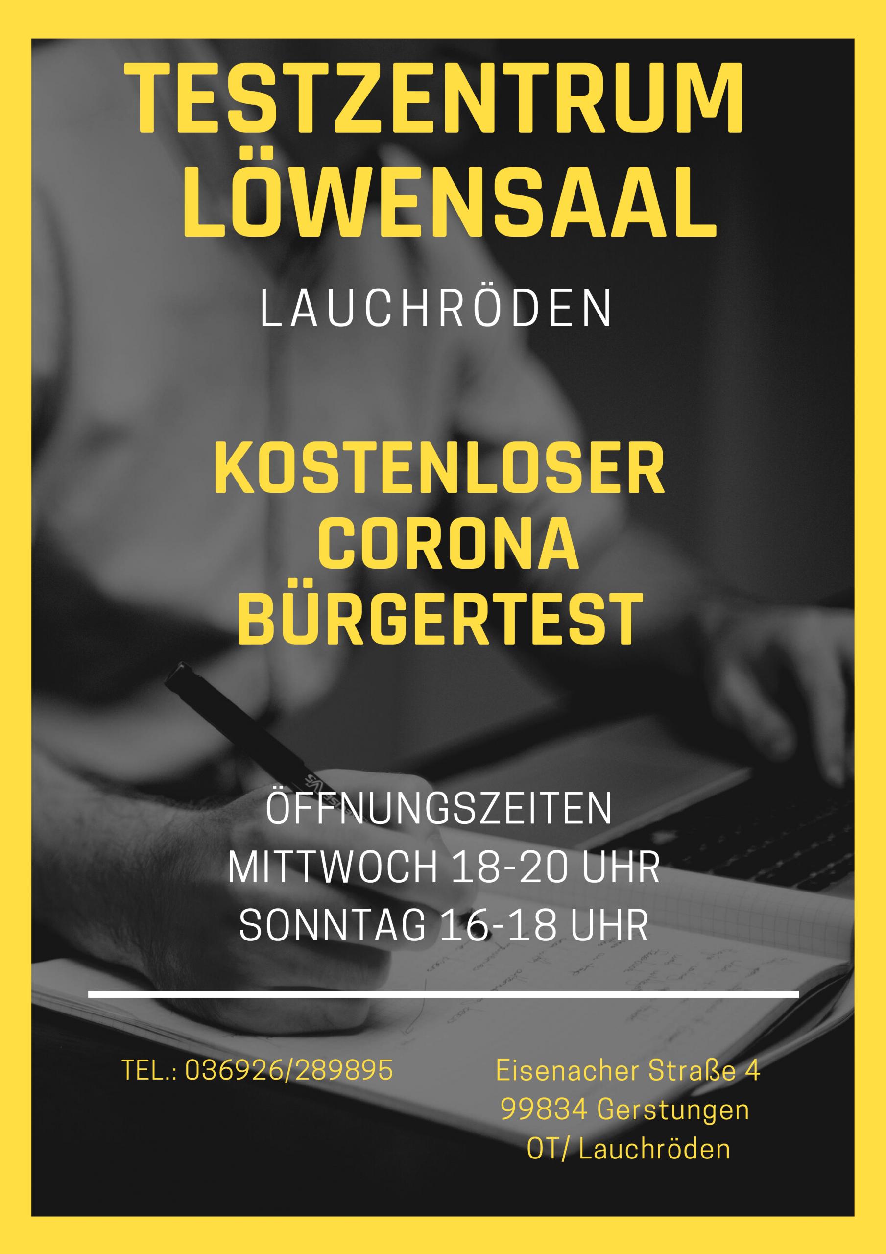 Neues Corona-Testzentrum in Lauchröden Im Ortsteil Lauchröden werden ab sofort kostenlos Corona-Tests im "Löwensaal" angeboten. Öffungszeiten: Mittwoch 18 - 20 UhrSonntag 16 - 18 Uhr Testzentrum Lauchröden0.3 MB