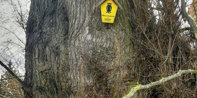 Schätzungen nach hat die Ulme einen derzeitigen Umfang von 5,20 Meter, einen Durchmesser von 1,60 Metern...