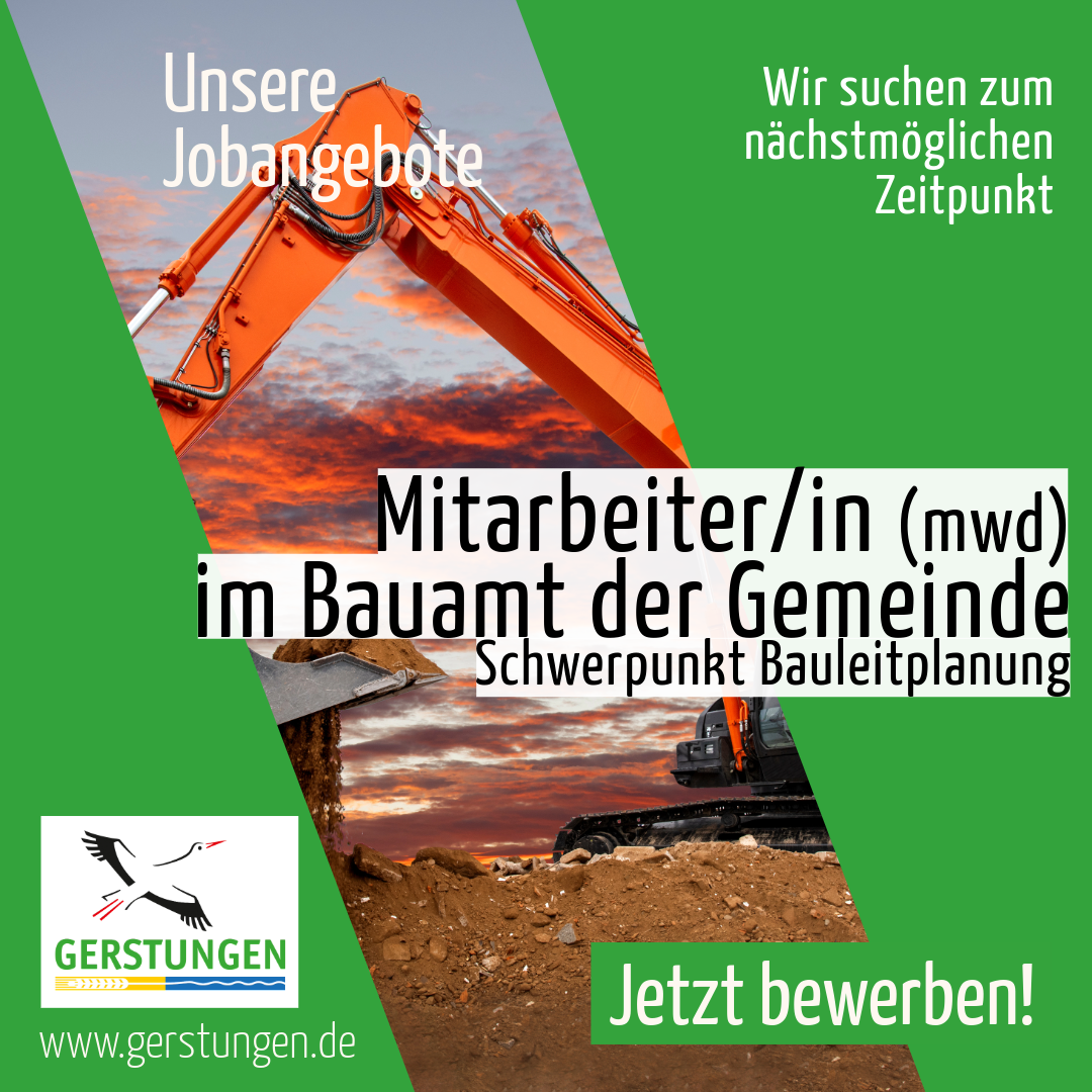 Die Gemeinde Gerstungen sucht zum nächstmöglichen Zeitpunkt eine Mitarbeiterin oder einen Mitarbeiter im Bauamt mit dem Schwerpunkt "Bauleitplanung".