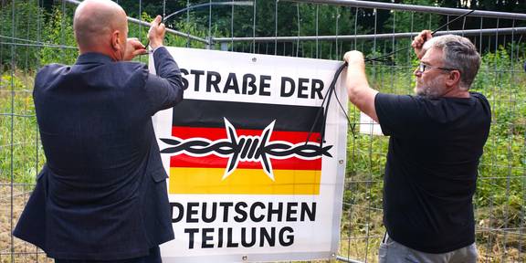 Gemeinsam mit Marco Schrön (stellv. Ortsteilbürgermeister Oberellen) hing ich gestern (23.7.25) die Protest-Banner auf. Seit über 30 Jahren verfällt die „Trasse“. Freistaat Thüringen und die Deutsche Bahn schieben sich die Zuständigkeiten hin und her. Aktuell liegen beide vor Gericht. Streitthema: Zuständigkeit für die Stützmauer. Fakt ist – es gibt keine Entwicklung dieser Straße. Ich erwarte vom Freistaat Thüringen (Straßeneigentümer) eine unverzügliche und verbindliche Aussage, wann diese „Straße der deutschen Teilung“ endlich saniert wird. Weitere Aktionen an der „Trasse“ werden folgen.