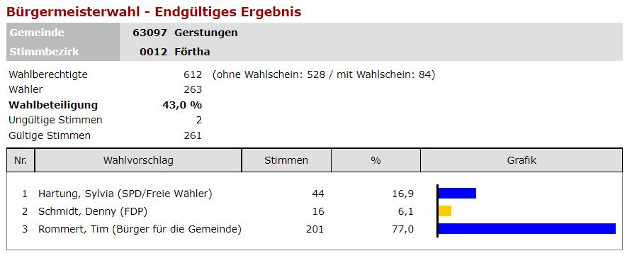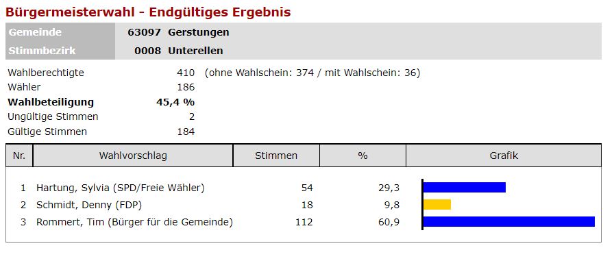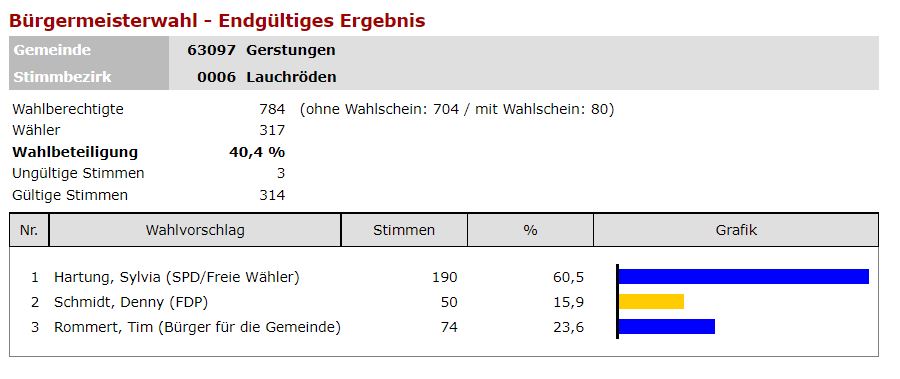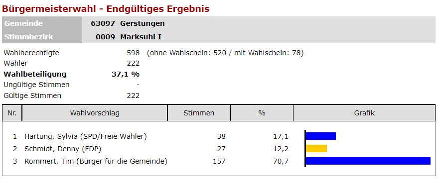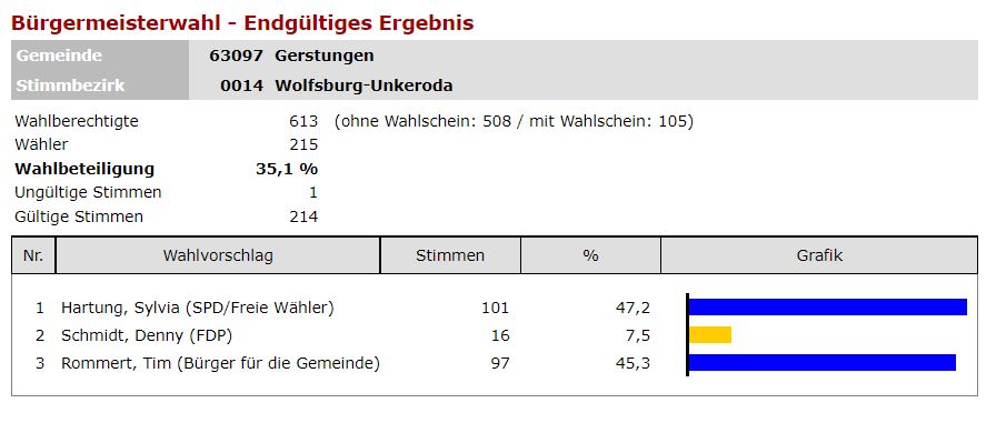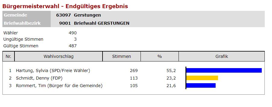 Da bei der Wahl am 10. April 2022 kein Bewerber mehr als die Hälfte der abgegebenen gültigen Stimmen erhalten hat, findet am Sonntag, dem 24. April 2022 von 8.00 Uhr bis 18.00 Uhr zwischen Hartung, Sylvia (1546 Stimmen) und Rommert, Tim (1505 Stimmen) eine Stichwahl statt. |