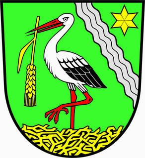 Das Wappen zeigt auf grünem Grund einen silbernen Storch mit roten Beinen und rotem Schnabel in einem goldenen Nest im Schildfuß stehend, im Schnabel eine goldene, abwärtshängende Ähre haltend...